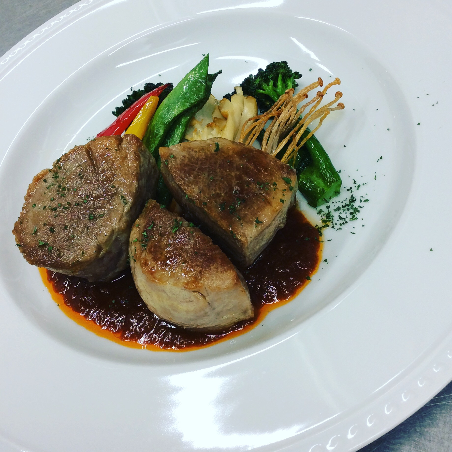お肉料理 2019/11/15 今週のランチタイムにお肉料理【豚ヒレのロースト】です。 じっくり時間をかけて焼いているので、柔らかくてしっとり!! とっても美味しいです。 たまには、ランチに贅沢してみてはいかがでしょうか(*´∀`*)? こちらはランチCコースになります。