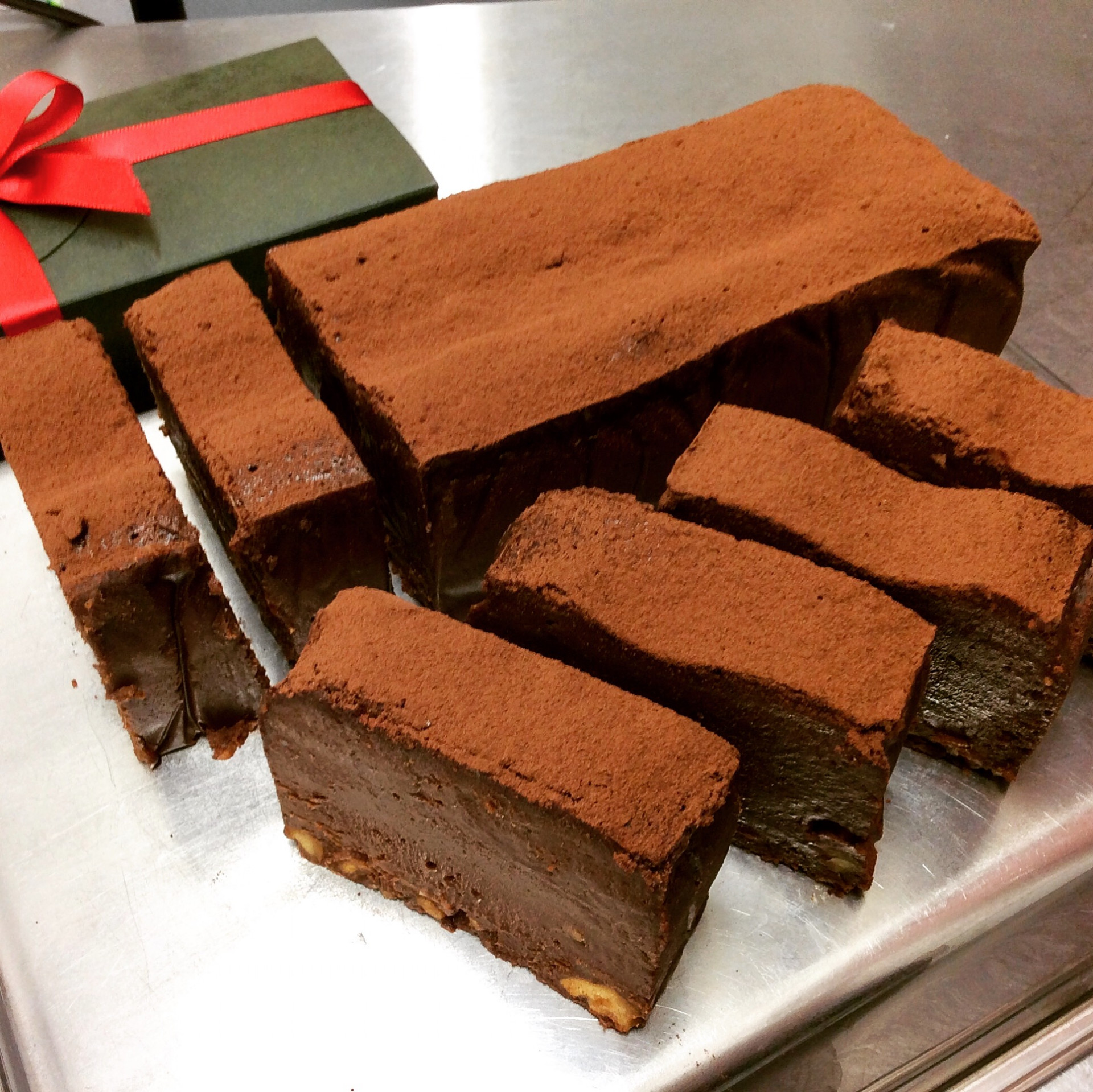 エルコレ特製のチョコレート生地とローストした胡桃をテリーヌ型に流し込み、食感を半熟の加減で