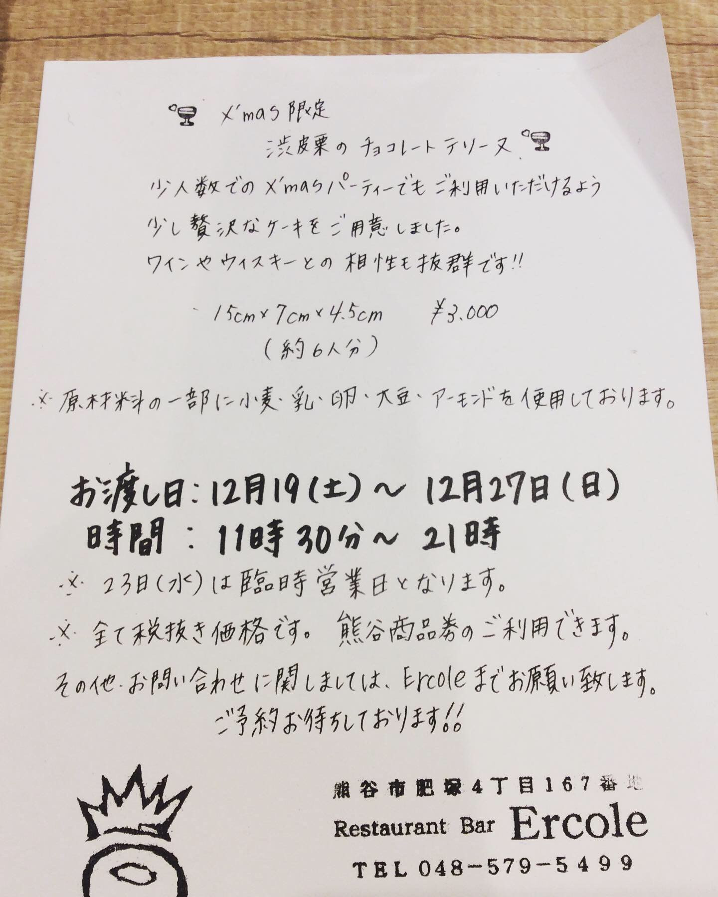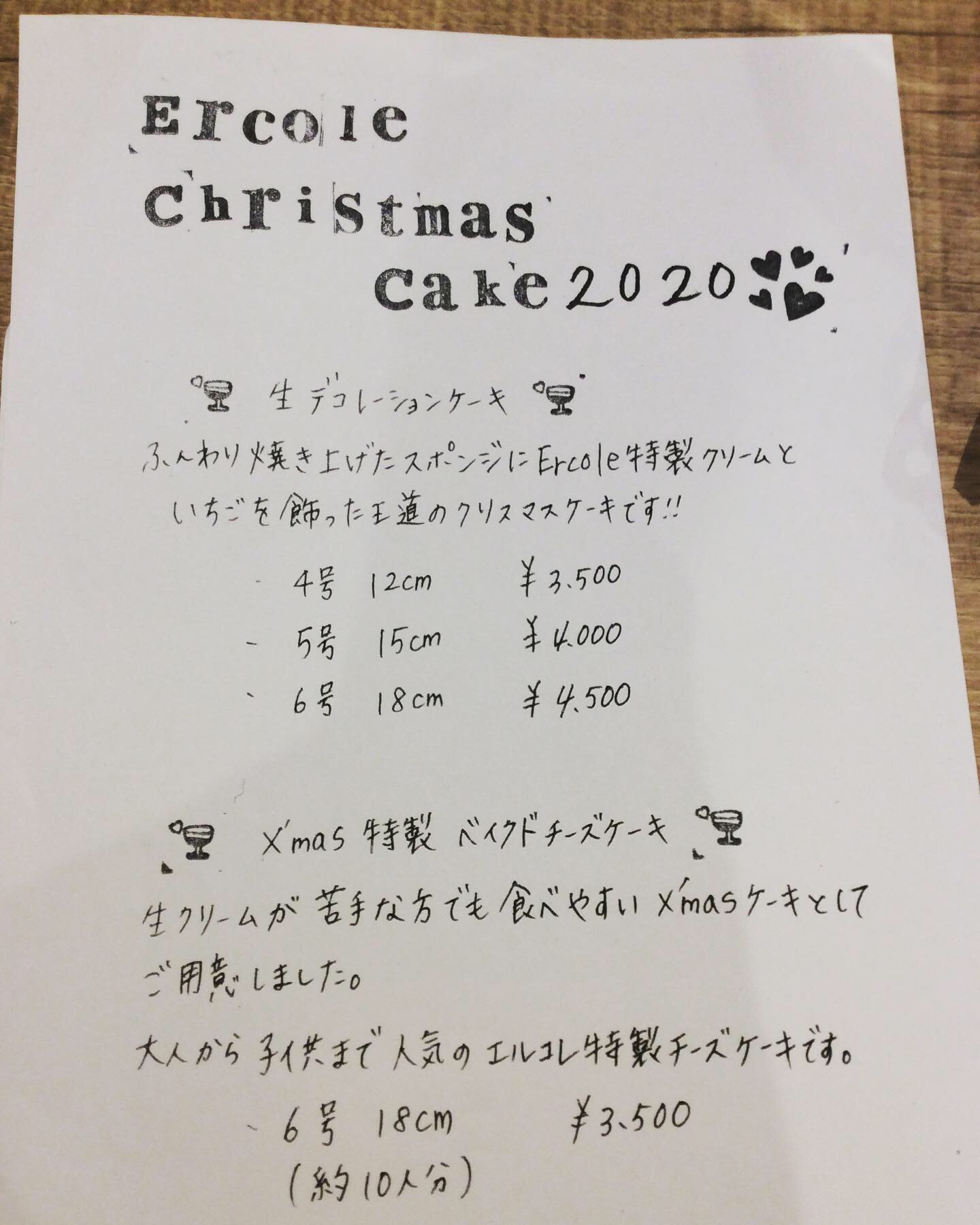 クリスマスケーキご予約受付中 2020/12/17 こんにちは。レストランバー・エルコレです。 クリスマスケーキのご予約はお済みでしょうか? エルコレクリスマスケーキのご予約まだ承っております。 写真は生クリームデコレーションケーキ4号サイズななります。 予約制になりますので、お電話・お問い合わせお待ちしてます。 二日前までにご予約ください。