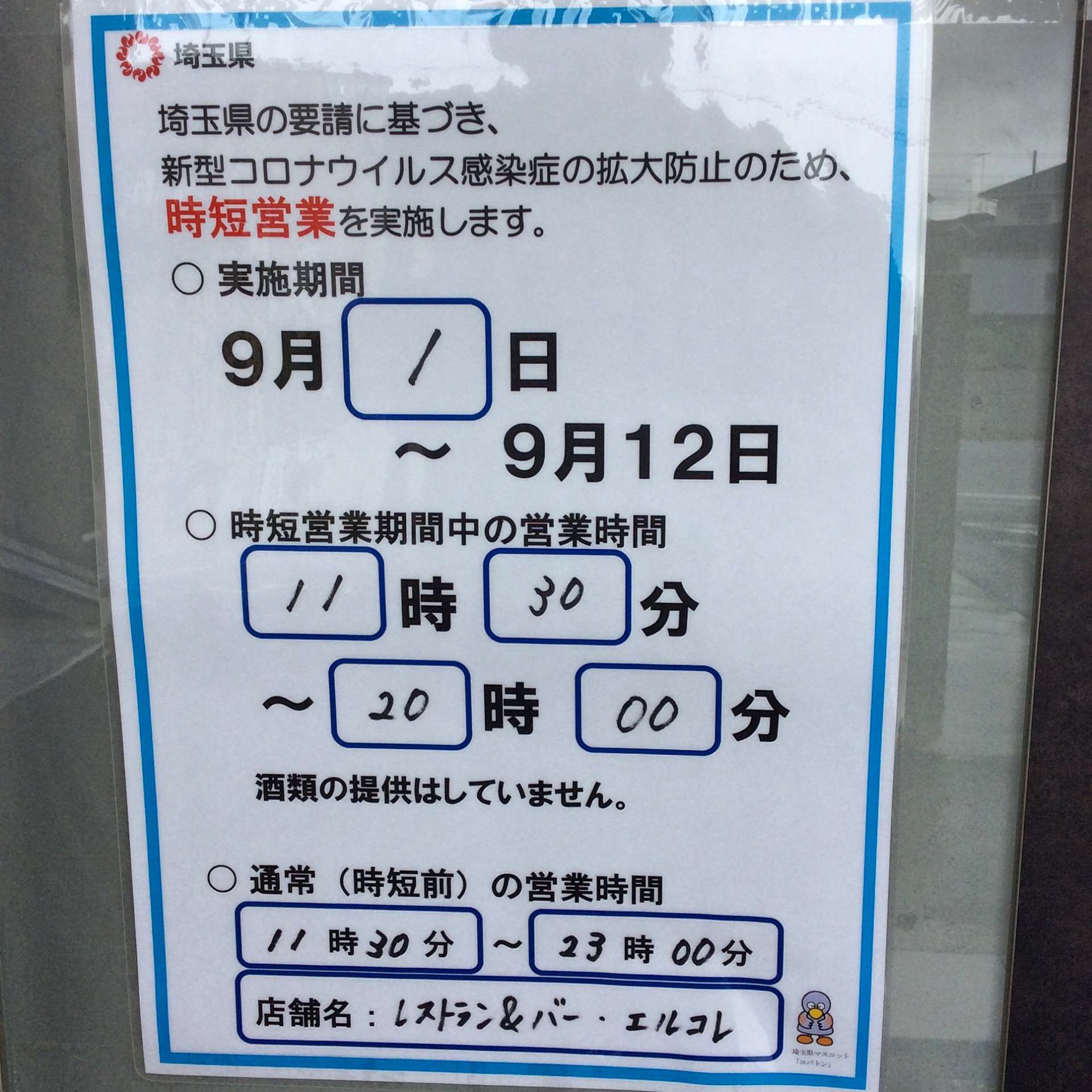 営業時間のお知らせ 2021/09/03 レストランエルコレです。 埼玉県の要請に基づき、新型コロナウイルス感染症拡大防止のため、引き続き時短営業を致します。 ・9月1日~9月12日 ・営業時間 11時30分~20時 ランチ 11時30分~15時(LO14時30分) ディナー 17時~20時(LO19時) 酒類の提供はしません。 コロナがいち早く終息することを願って、今は頑張りましょう。