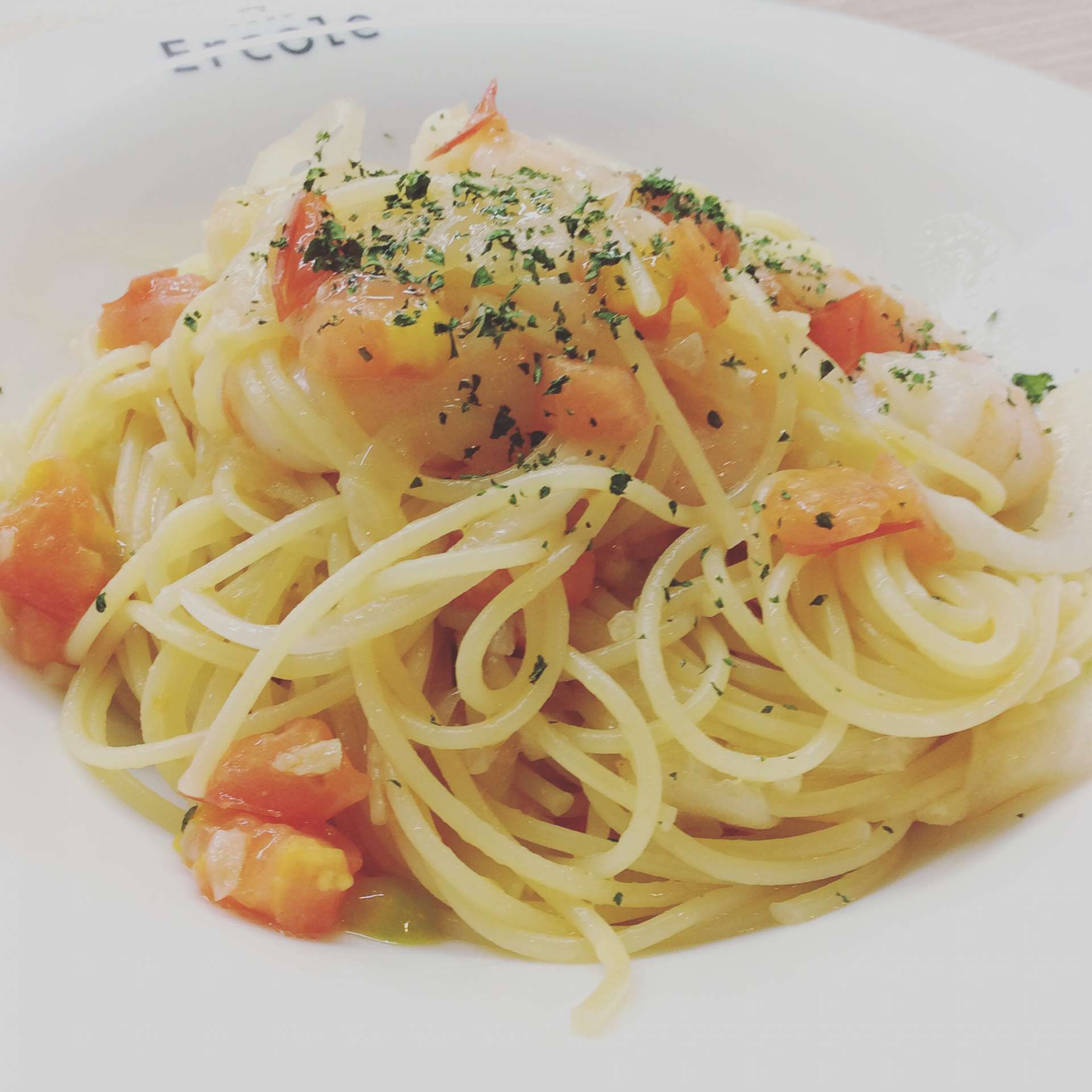 海老とフレッシュトマトとオニオンの塩パスタ 2021/10/01 レストランエルコレです。 今週のランチパスタ②海老とフレッシュトマトとオニオンの塩パスタです。 こちらのパスタは前回のグルメパスポートの写真になったパスタです。 台風16号の影響かお客様少ないです(;_;) ご利用お待ちしてます。