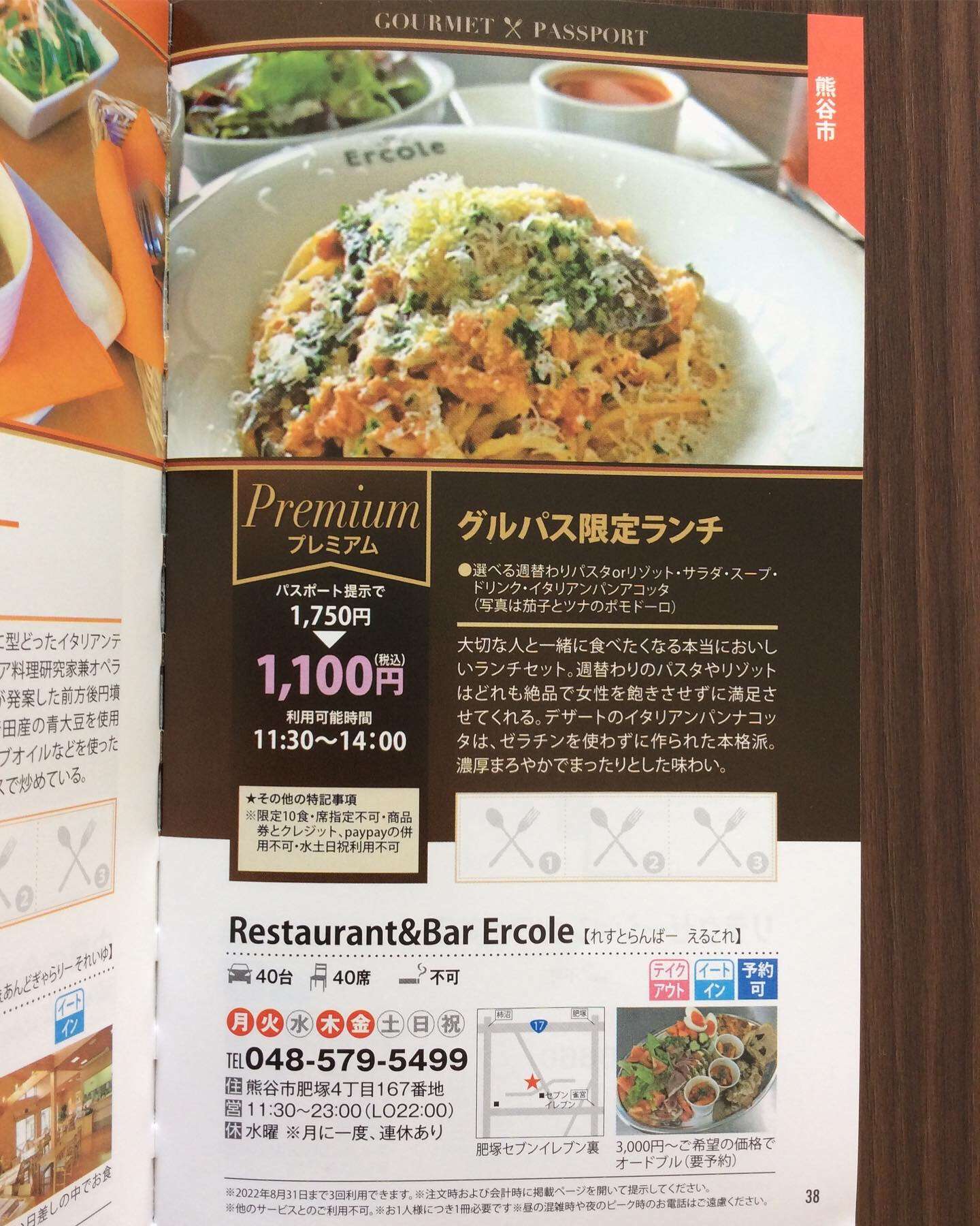 グルメパスポート熊谷 2022/06/06 レストラン&バー・エルコレです。 グルメパスポート10 2022年6月1日~8月31日 熊谷市の一番最後の38ページがエルコレになっております。 今回も沢山のお客様のご利用お待ちしてます(^-^)