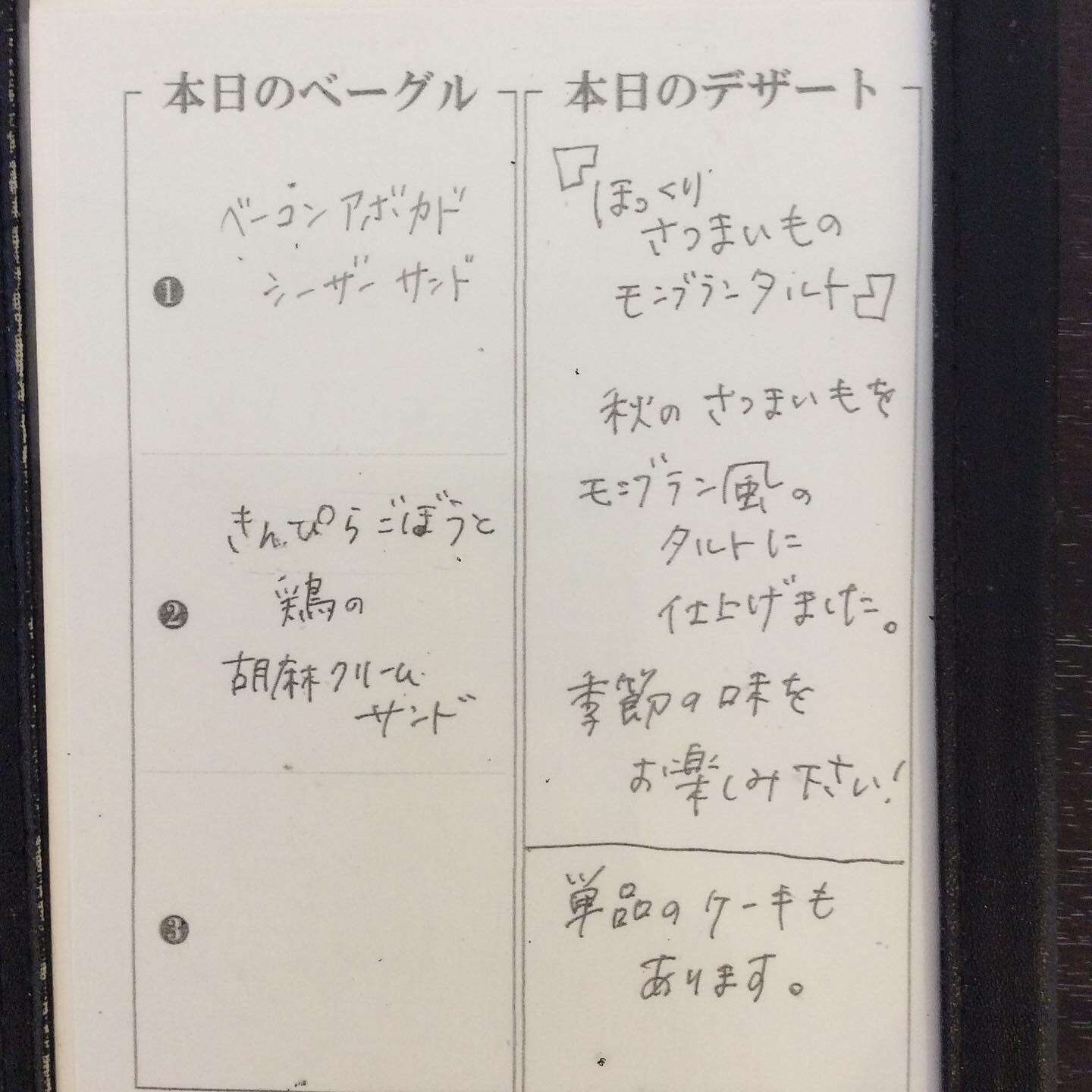 今週のランチメニュー 2023/10/26 レストラン&バー・エルコレです。 10がう26日(木)~31日(火)までのランチメニューです。 今週のオススメパスタ ③生ハムと長ねぎのクリームパスタ オススメベーグル ②きんぴらごぼうと鶏の胡麻クリームサンド デザートプレート 数量限定 【ほっくりさつまいももモンブランタルト】 秋のさつまいもをモンブラン風のタルトに仕上げました。 季節の味をお楽しみ下さい。 今週もご来店お待ちしてます。