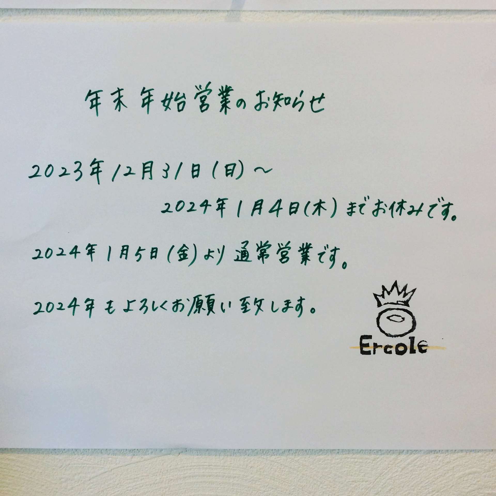 年末年始お休みのお知らせ 2023/12/29 レストラン&バー・エルコレです。 年末年始のお休みのお知らせです。 本年も沢山の御愛顧を賜り、ありがとうございました。 来年も良質な時間を過ごしていただける店であり続けられるよう、丁寧な仕事はもちろん、 心地良いサービスを心かけてまいります。 来年もどうぞよろしくお願い致します。 良いお年をお迎え下さい。