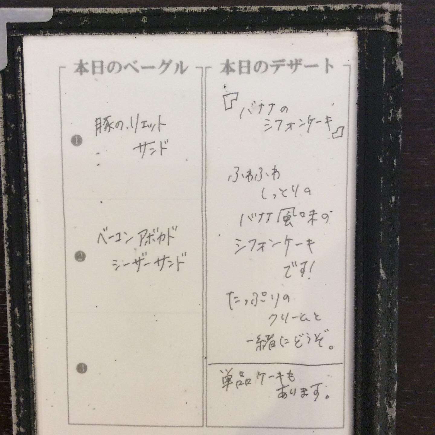 今週のランチメニュー 2024/12/12 レストラン&バー・エルコレです。 2024年も残すところあと僅かです。 最近、インフルエンザが流行しているみたいですので、手荒いうがいをしっかりして、 美味しいものを食べて予防していきましょう!! 今週のオススメランチパスタ ③深谷ねぎと明太子のクリームパスタ オススメベーグル ②ベーコンアボカドシーザーサンド ランチ限定デザートプレート 【バナナのシフォンケーキ】 ふわふわしっとりのバナナ風味のシフォンケーキです。 たっぷりのクリームと一緒にどうぞ!! ご来店お待ちしてます。
